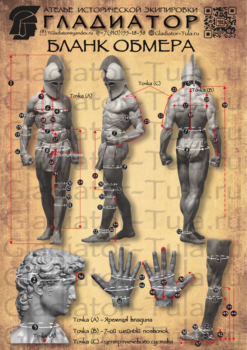 Для изготовления заказа вам необходимо правильно снять мерки. Это позволит нам качественно выполнить заказ, а вам получить удовольствие от ношения доспехов и исторического костюма. Поэтому учтите следующие советы: