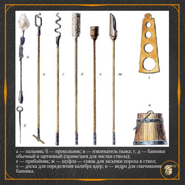 После выстрела внутри пушки могли остаться тлеющие частицы картуза (порохового мешка). Если заложить новый заряд сразу, он мог взорваться прямо в руках пушкаря. Чтобы этого не случилось, ствол протирали «банником» — щеткой на длинном древке, которую предварительно макали в ведро с водой.