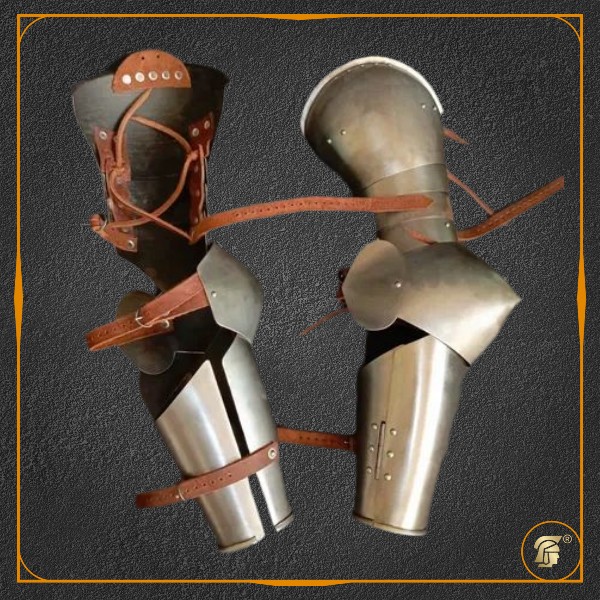 Комплект латных рук состоит из сегментных наплечников, брассаров, острых налокотников, наручей. Такая бюджетная конструкция обеспечивает достаточную защиту руки от плеча до запястья, при этом сохраняя подвижность и удобство в бою. Острый налокотник усиливает защиту.
