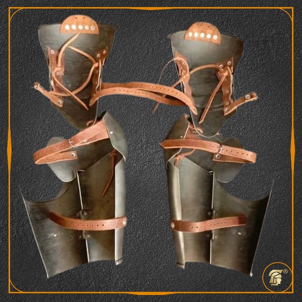 наручи двустворчатые, на длинной петле, крепится к налокотнику на шнурках, что позволяет предплечью свободно вращаться;