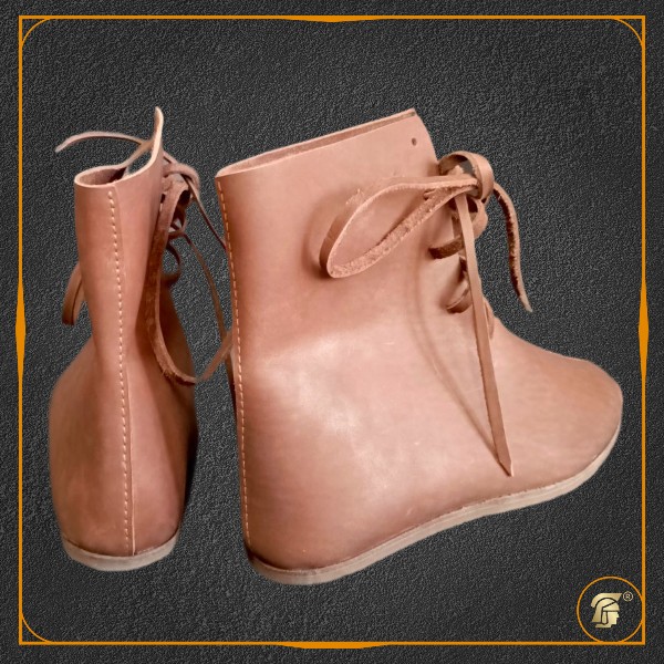 Пара высоких кожаных ботинок с передним швом на подъёме и шнурками - это классическая модель кожаной обуви, основанная на археологических находках, распространенных на территории Европы и Древней Руси в течение длительного периода с IX по XVII века.