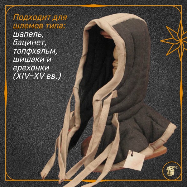 Стёганые подшлемники с пелериной использовались в XIII–XVII вв. как обязательный элемент поддоспешного снаряжения. Они отлично сочетаются с большинством моделей открытых и закрытых шлемов позднего Средневековья Европы, а также русскими шишаками и ерехонками (XIV–XV вв.). Подобные изделия применялись как самостоятельные защитные головные уборы лёгкой пехоты и лучников.