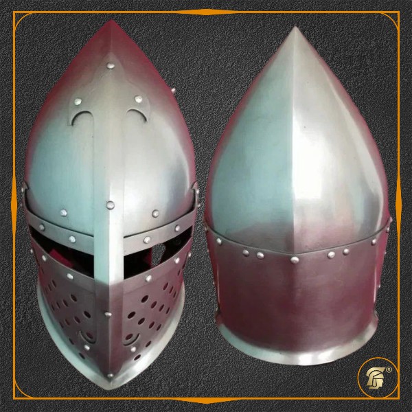 Часто такие шлемы украшали: латунными крестами, фигурными прорезями, перьями, коронами и даже металлическими крыльями — особенно у тевтонских рыцарей.