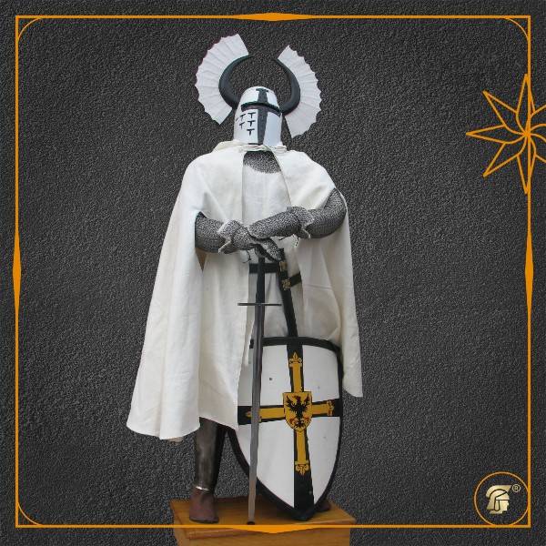 Топфхельм (англ. Great Helm), или «горшковый шлем» — один из самых узнаваемых рыцарских доспехов Высокого Средневековья. Появившись в конце XII века, своей классической цилиндрической формы он достиг к середине XIII столетия. Именно такие шлемы носили крестоносцы и европейские рыцари в сражениях при Борнхольде и в других ключевых битвах той эпохи. Массивный, полностью закрывающий голову топфхельм обеспечивал превосходную защиту от рубящих ударов, но ограничивал обзор и вентиляцию, поэтому часто надевался уже непосредственно перед атакой поверх кольчужного капюшона (коифа) и малого шлема. Представленная модель «Магистр» с декоративными рогами отражает геральдическую традицию украшения доспехов, характерную для знатных воинов.