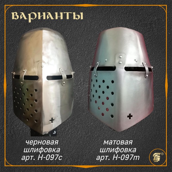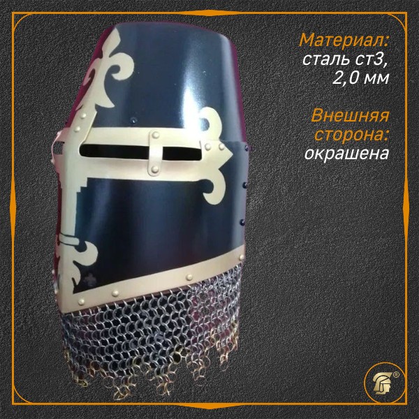 Вы можете купить данный шлем в предлагаемой комплектации и черновой шлифовке. Все изделия мы делаем на собственном производстве по индивидуальным меркам заказчика (как их правильно снять, уточняйте у менеджера). По вашему желанию, мы можем изменить вид стали (нержавеющая, ст45 с закалкой) и способ обработки металла (матовая шлифовка/полировка/покраска), а так же воссоздать позолоченный крест на забрале и добавить бармицу из стальных и латунных колец.